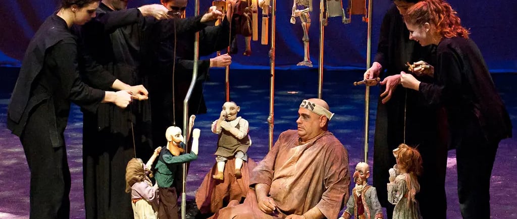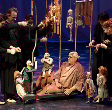 The design elements appear simple but are cleverly versatile, from the alternately majestic and cagelike Prague skyline by Roman Hladik to wooden marionettes by Jakub Krejci. But foremost kudos go to Naomi Goldberg Haas, who choreographed the performance and created the show in collaboration with the writer and artistic director of the troupe, Vit Horejs, who also directs here.